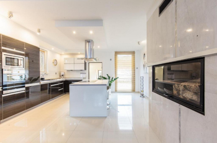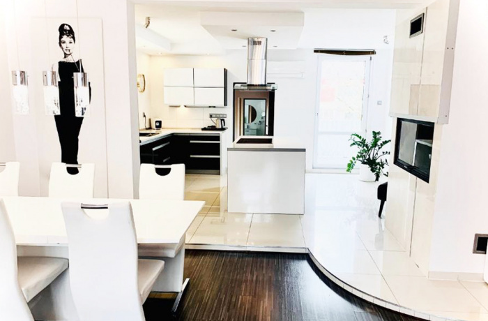 - kuchnia z wyspa połączona z salonem